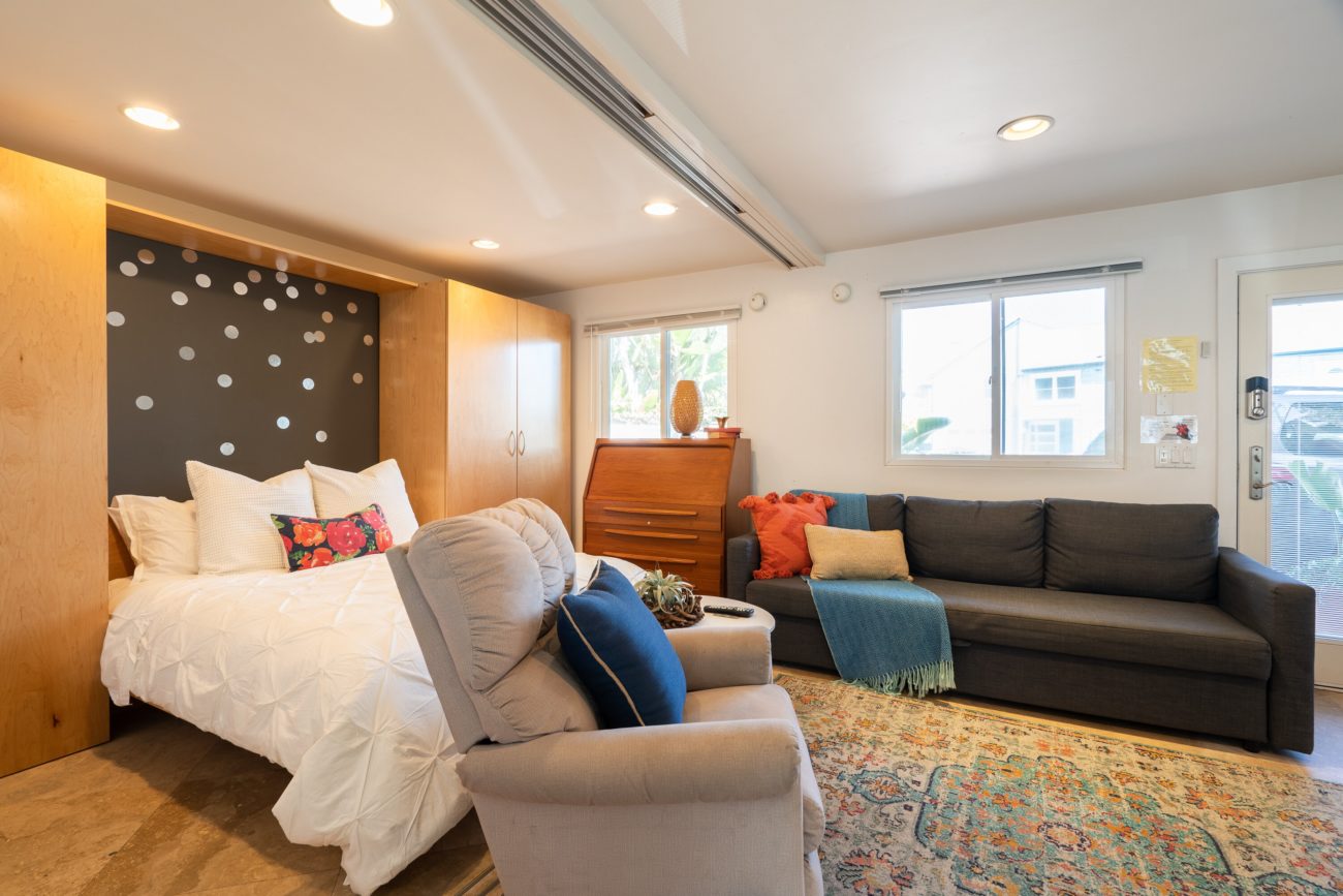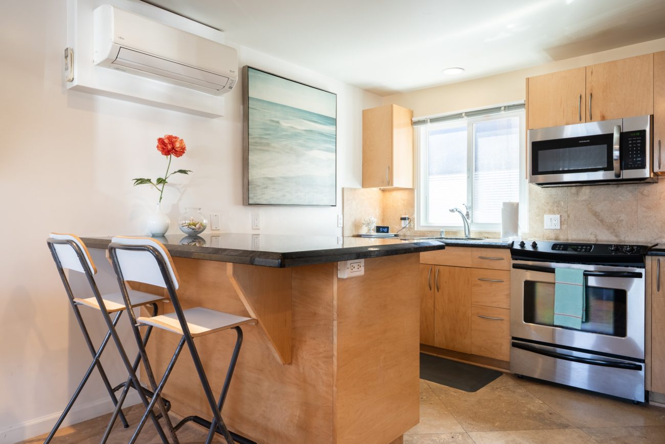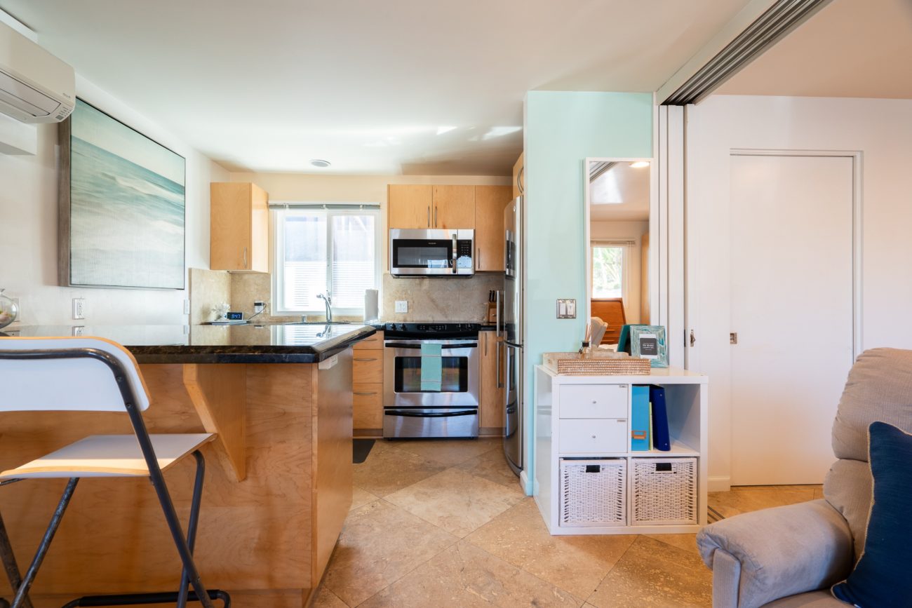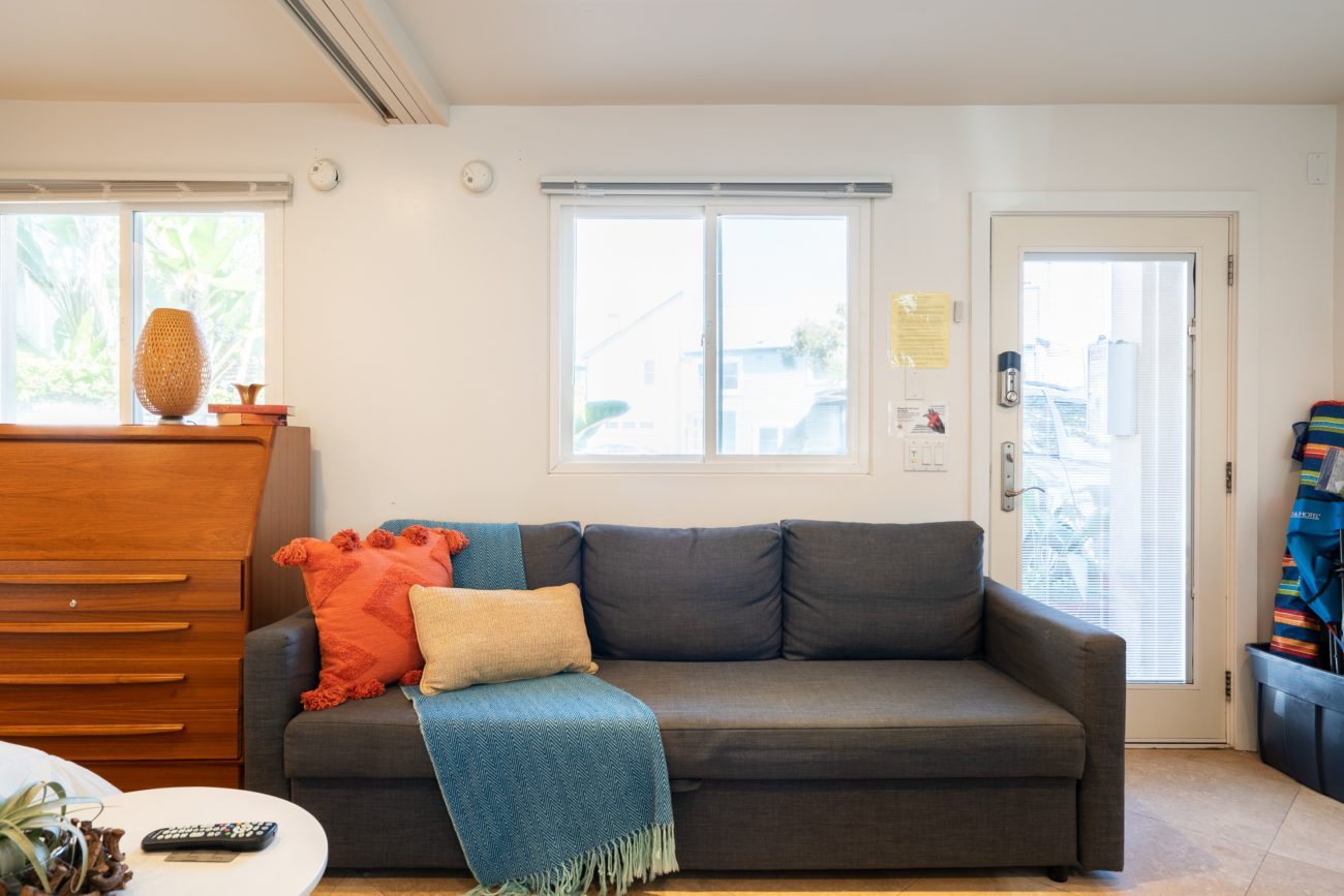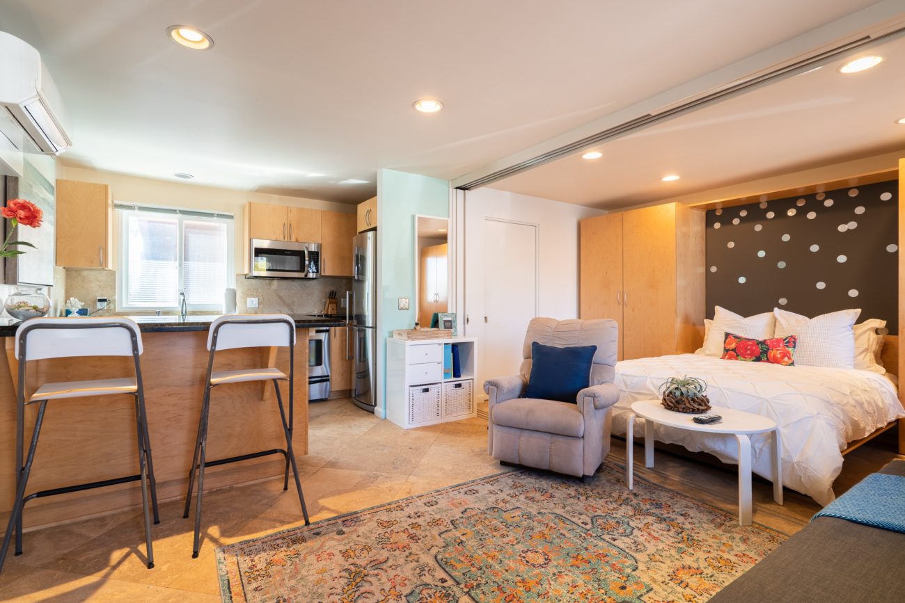 Literally 200 ft from the Pacific Ocean boardwalk and 5 mins walk to Mission Bay, this studio condo with luxury designer is just what you need for your seaside retreat. The beach getaway with modern conveniences is located at the southern tip of famous Mission Beach and only a short walk to stores, groceries and restaurants and is the ideal place to spend a quiet and relaxing vacation. A great place for couples, solo adventurers, business travelers and families (with kids). Located on the ground floor / street level of the building, single flight of stairs. Includes free wifi, AC/Heat, dedicated off-street parking.
