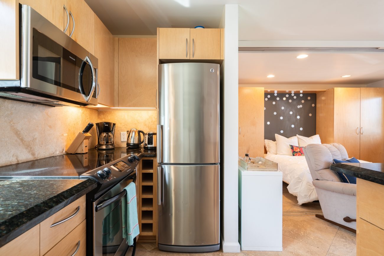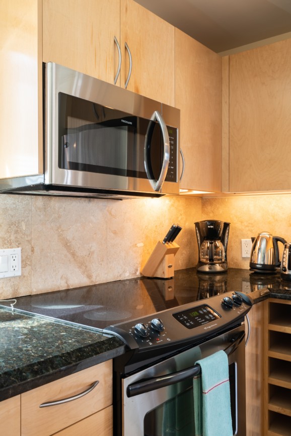 Our units come equipped with everything you need to make your stay comfortable and enjoyable. The full chef's kitchen is perfect for all your cooking needs, complete with stainless steel appliances, a coffee maker, and a dishwasher. The marble bathroom with a deep soaking tub is perfect for relaxing after a day at the beach. You'll also have access to cable TV and Wi-Fi, so you can stay connected while enjoying your vacation.